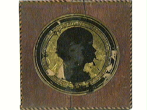 Siluettporträtt på åttkantig glasskiva. Bakom denna en motsvarande träplatta som bakstycke. Detta är infattat i en ram av mahogny med en rundel utsågad framtill. Inläggningsbård i ytterkanten. Glasskivans baksida är belagd med bladguld (troligen) förutom den siluettbild och det cirkelmönster som skall visa den svarta lack som hela baksidan är belagd med. I mitten siluetten, omkring den en ring med slingrande svart mönster, därefter en bred svart ring. Ramen sprucken. Guldet och lacken är sprucket på flera ställen och är mycket skört.