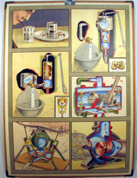Skloplansch. På baksidan två etiketter. Den ena med texten: "Nr. 3 pumpar: Svenska Skolmatrielförlaget. Gunnar Saietz A.-B. Stockholm", och de andra med en handtextade påskriften: "D3". Upphängningsdon samt skoningar i metall. I upphängningsdonet står numret 618. Planschen visar olika typer av pumpar.