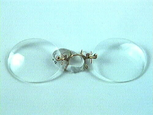 Glasögon, Pincenez. Glas sammansatta med metalldel, fastskruvad i glasen. Fjäderbelastade clips. Metalldelen är graverad: "CN-GEE-10cl". Modellen saknar skalmar.