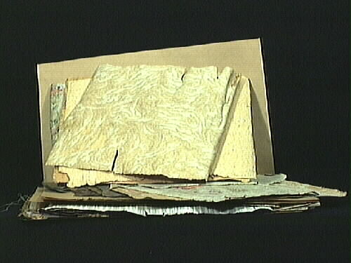 Tapetstycke med väggfyllning. Ca 10 st olika tapetlager. På baksidan väggfyllning, pålagt för att göra väggen slät. Fyllningen består av lera eller kalkbruk i blandning med grovt sågspån. I fyllningen syns avtryck av mellanrum mellan väggstockar. Översta tapeten grå med vita ränder, breda, raka och smala, slingrande. Nertagen i lägenhet i Kv Ajax 10.