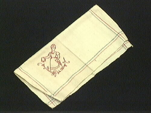 Dammduk av grov, ofärgad linneväv med parallell röd och blå rand runtom. I ena hörnet broderat motiv föreställande kvinna. Motivet är broderat med röda stjälkstygn.