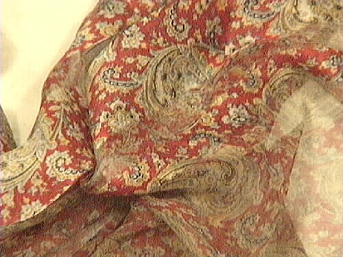 Schal, i siden orientmönstrad i rött. Maskinfållad i kanterna. Tunnsliten, något trasig.