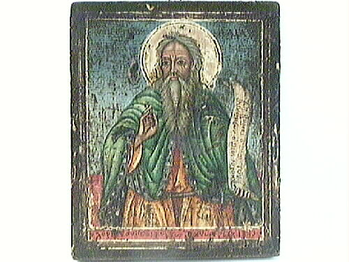 Grekisk ikon. Motiv: Profeten Sefanja med långt skägg och grön pälsbrämad klädnad över vit dräkt. Högra handen är lyft till välsignelse, i vänstra handen ett skriftband. Guldet på glorian är nästan helt borta. I övrigt blå bakrund med rött skriftfält i nederkant. Där finns årtalet 1883 målat. På baksidan träplatta med maskhål, avfasad och svartmålad. Även spik och tråd till upphängning. På baksidan även siffrorna 1501 men även nummer som är övermålade.