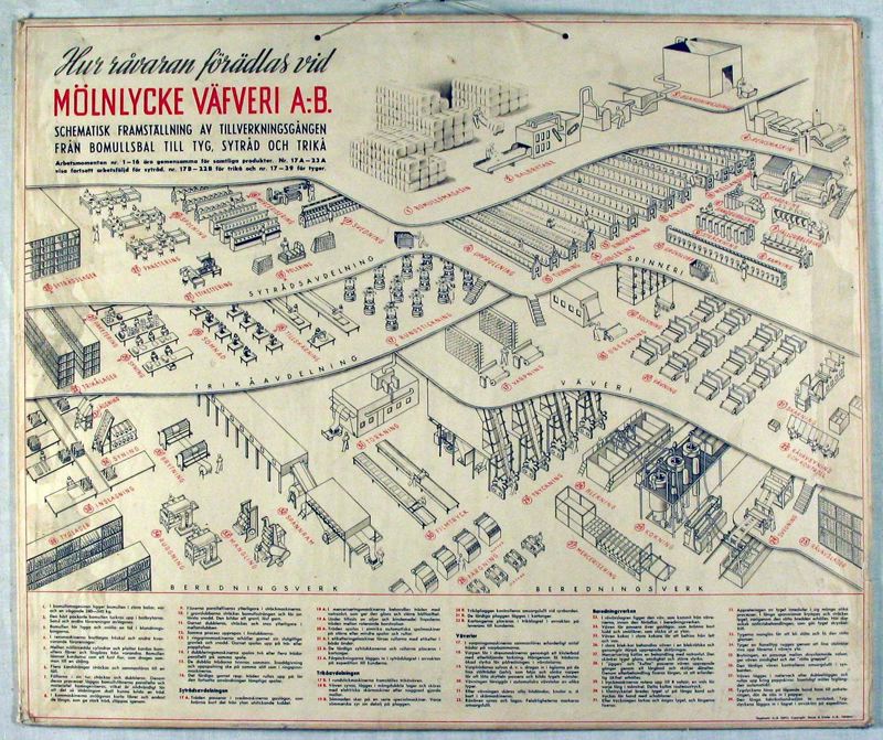 Skolplansch, rektangulär pappskiva. På framsidan finns en schematisk bild av ett väveri i industriellt format. Rubrik längst upp i vänstra hörnet, "Hur råvaran förädlas vid, MÖLNLYCKE VÄFERI A-B SCHEMATISK FRAMSTÄLLNING AV TILLVERKNINGSGÅNGEN FRÅN BOMULLSBAL TILL TYG, SYTRÅD OCH TRIKÅ". Arbetsmomenten nr 1-16 äro gemensamma för rsamtliga produkter. Nr 17A- 23A visar fortsatt arbetsföljd för sytråd, Nr 17B -22B för trikå och nr 17-39 för tyger". Längst ner under bilden en beskrivning av arbetets gång. Nere i högra hörnet står "Djuptryck, A-B DEFO". Copyright: Meyer & Köster A.-B. Göteborg. Tillhör skolsamling och har förvarats på Kylanderskolans vind.