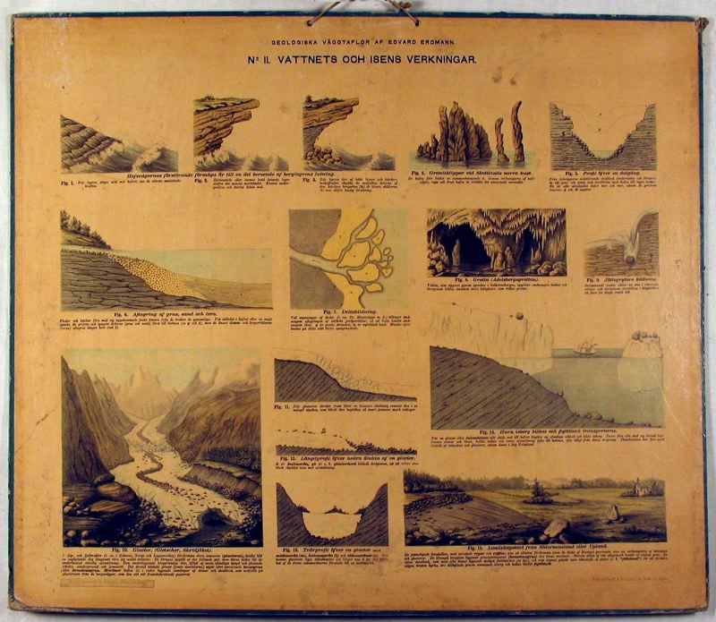 - Skolplansch, rektangulär. Flerfärgstryck finns på framsidan. Bild av vatten och is och dess verkningar. Längst upp i mitten rubrik "GEOLOGISKA VÄGGTAVLOR OCH ISENS VERKNINGAR". Under står No 11, "VATTNETS OCH ISENS VERKNINGAR". Längst ner i det vänstra hörnet står "P.A. Norstedt & Söner, STOCKHOLM". Och i det vänstra hörnet står "FÖRL, OCH TR, AF A. BORTZELLGEN,STAB, LIT, ANST". På baksidans övre högra hörn, etikett "D16". Planschen något trasig i kanterna runt om. Tillhör skolsamling och har förvarats på Kylanderskolans vind.