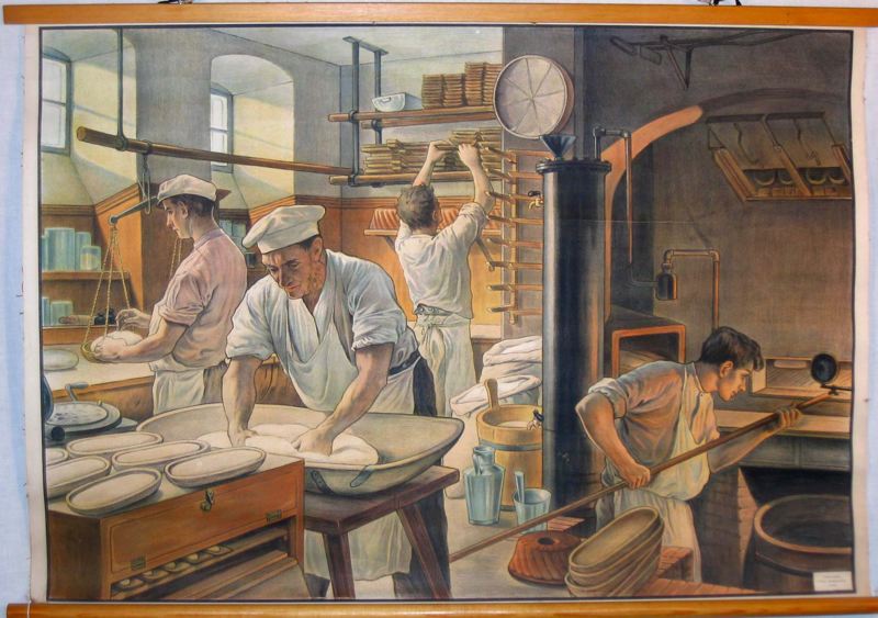 Skolplansch i flerfärgstryck. Motiv: Bagare i arbete. Träkanter upp och nertill. I överkant står det "i bageriet". Text i nedre högra hörnet "GLEERUPSKA UNIV-BOKHANDELN LUND". Tillhör skolsamlingen och har förvarats på Kylanderskolans vind.