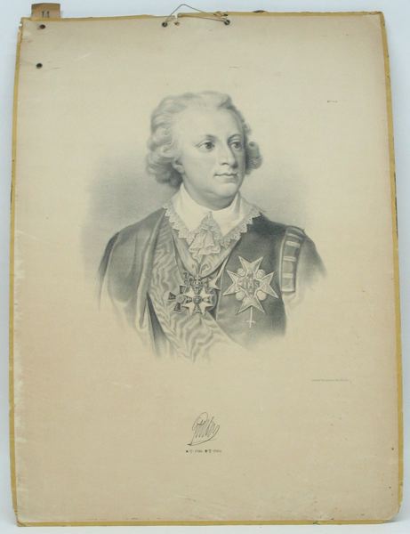 Plansch i svart vitt. Bröstbild på Gustaf III. Under porträttet namnteckning"Gustaf *13/1 1746 +16/3 1792. Till höger text "Central Tryckeriet Stockholm". På baksidan märkt "14". Tillhör skolsamlingen och har förvarats på Kylanderskolans vind.