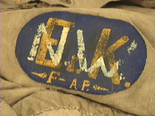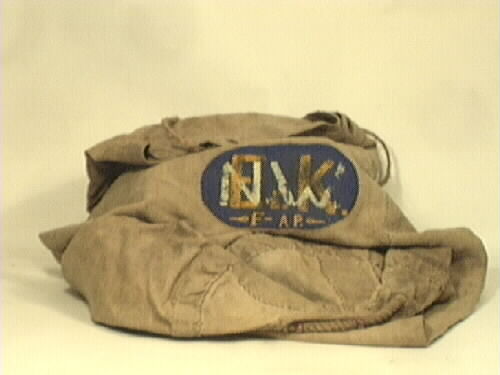 - Sjömanssäck. Sydd av två stycken, dubbelsöm. Botten sydd av kilar. Hål med kauser runt mynningen. Ungefär mitt på ena sidan. Oval målad etikett men initialer, "Er.K". Över "F-AP", "Er.K", övermålat med "N.W." Etiketten är sydd på säcken. Ofärgat tyg.