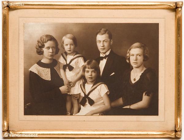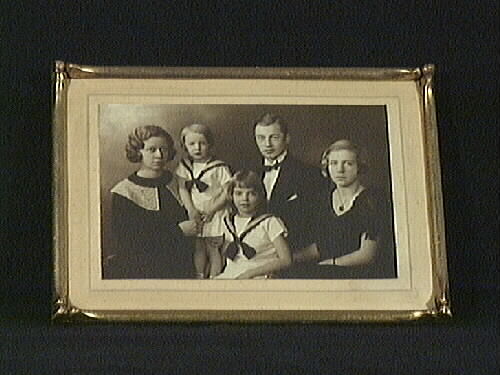 - Gruppfotografi med ram. Rektangulärt, retuscherat fotografi med smal förgylld ram. De avbildade är syskonen Åmark fr. v. Ninni f. 1916, Agneta f. 1931, Marie-Louise f. 1925, Gunnar f. 1915 och Anne-Marie f. 1917. De tre äldre syskonen är barn till Emil Åmark och Ingrid Åmark, f. 1919. De två yngsta är barn till Emil Åmark och Nanna Henriksson. Uppgiftslämnare: Ingrid och Gunnar Åmark.