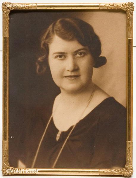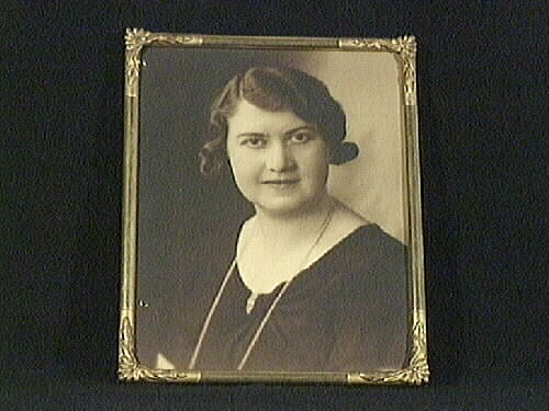 Porträttfoto med ram som är bruntonat och retuscerat. Tunn förgylld ram med bladslingor i hörnen. Den avbildade var under en kort tid (1936) lärarinna i tyska vid Lidköpings realskola.