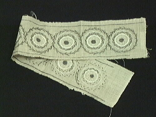 Broderiprov på oblekt linneväv. Cirkelmönster sytt med grått och vitt lingarn. Tillhör en personlig samling med olika arkivalier från Lisa Meléns liv såsom bokmanus och tidningsutklipp. Samlingen innehåller dessutom olika duk, väv, broderi, spets, virk, band och sömnadsprover mm. Lisa Melén (*1917 +1987) var verksam som hemslöjdschef för hemslöjden i Lidköping alltsedan den öppnade 1948. Hon var även en produktiv författarinna och uppskattad kursledare. Samlingen är skänkt av hennes man, Gunnar Melén. Källa: Lisa Meléns arkiv, Vänermuseet