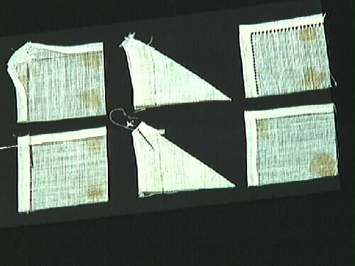 Broderiprov. På svart kartong är bitar av linneväv uppklistrat. Demonstrerar steg för steg hur man fållar ett hörn. Tillhör en personlig samling med olika arkivalier från Lisa Meléns liv såsom bokmanus och tidningsutklipp. Samlingen innehåller dessutom olika duk, väv, broderi, spets, virk, band och sömnadsprover mm. Lisa Melén (*1917 +1987) var verksam som hemslöjdschef för hemslöjden i Lidköping alltsedan den öppnade 1948. Hon var även en produktiv författarinna och uppskattad kursledare. Samlingen är skänkt till Vänermuseet av Lisas make, Gunnar Melén.