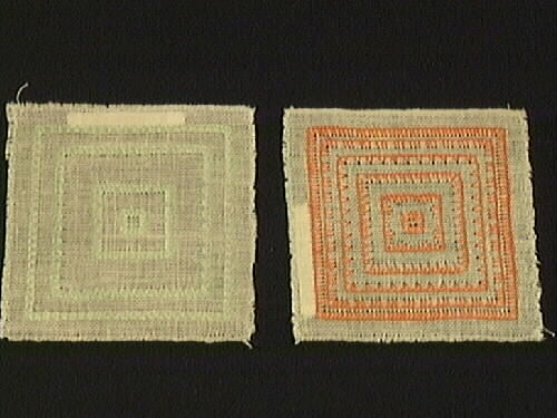 - Broderiprov, två stycken sytt som fyrkanter. 1 Langettsöm på vit linneväv med grönt linnegarn. 2 Langettsöm på vit linneväv med orange linnegarn. Tillhör en personlig samling med olika arkivalier från Lisa Meléns liv såsom bokmanus och tidningsutklipp. Samlingen innehåller dessutom olika duk, väv, broderi, spets, virk, band och sömnadsprover mm. Lisa Melén (*1917 +1987) var verksam som hemslöjdschef för hemslöjden i Lidköping alltsedan den öppnade 1948. Hon var även en produktiv författarinna och uppskattad kursledare. Samlingen är skänkt av hennes man, Gunnar Melén. Källa: Lisa Meléns arkiv, Vänermuseet
