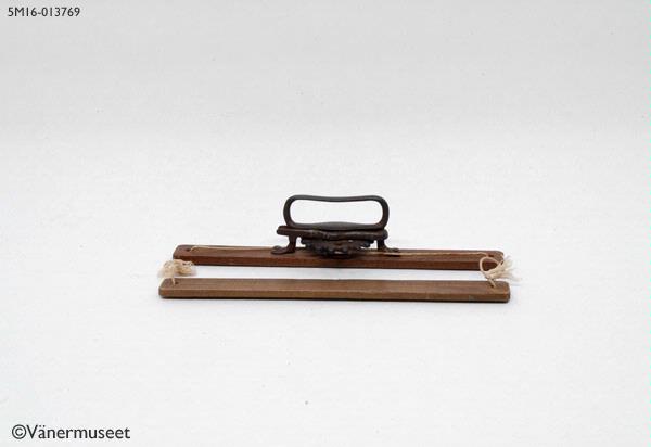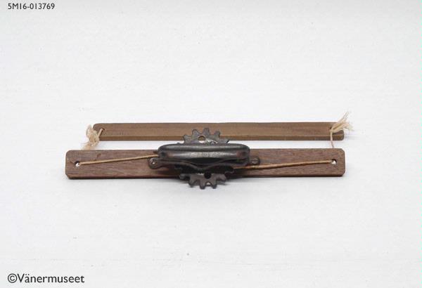 Bokbärare, två träribbor som dras samman med ett tandat hjul med handtag. Tillverkad av en vaktmästare på realskolan i Lidköping. Uppgiften om tillverkare kommer från Margareta Svensson = givaren.