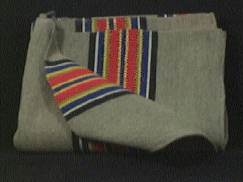 Filt. Grå med svarta, vita, blåa, gula, gröna och röda fält/ränder. Fållade kortsidor, delvis lagat med blå tråd. Långsidora något slitna, mindre fläckar. Kristina Persson, född 1850, syster till Gustav Carlander. Garn spunnet av ull från gårdens får.