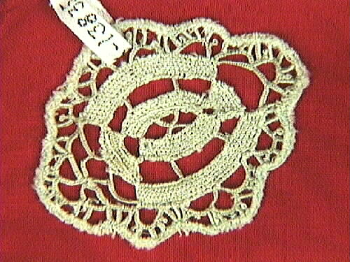 Spetsprov, oval form avsedd för infällning. Utförd vid Lidköpings slöjdskola under ledning av Fröken Elin Swahn. Nr 83 vid inventering av sydda spetsar 1985, Lisa Melén. Givare: Margareta Svensson, fd slöjdlärarinna vid Kylanderskolan.