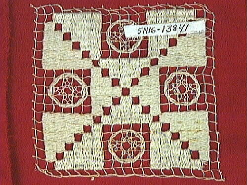 Spetsprov i rutmönster bestående av fem delvis fyllda fyrkanter samt mellan dessa fyra cirklar. Givare: Margareta Svensson, fd slöjdlärarinna vid Kylanderskolan.