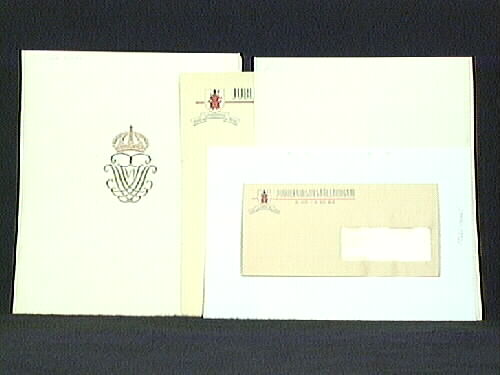 Förlaga till adress. Kronprins Gustav Adolf monogram mitt på blankt ark. Svart, guld, rött... Märkt upptill: "1:sta bladet". För Lidköpings-jubileet 1946.