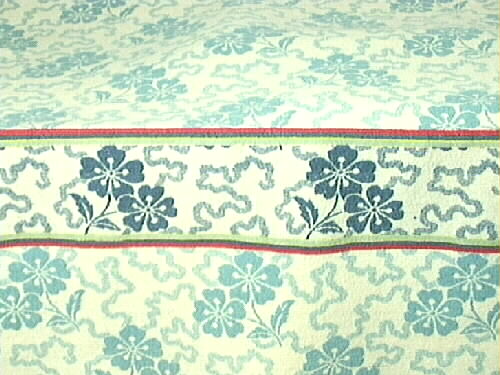 - Filt. Blommönster i vitt på blågrön botten. På kortändarna samma mönster på mörkare blått, inramat av klara röd och gula ränder. Äldre och yngre kantstopp. Enligt uppgift av givaren använde fabriken vid denna tid mycket australiensiskt ull. En av delägarna, Sven Fredrik Lundberg var färgare i Lidköping och farfar till givaren.