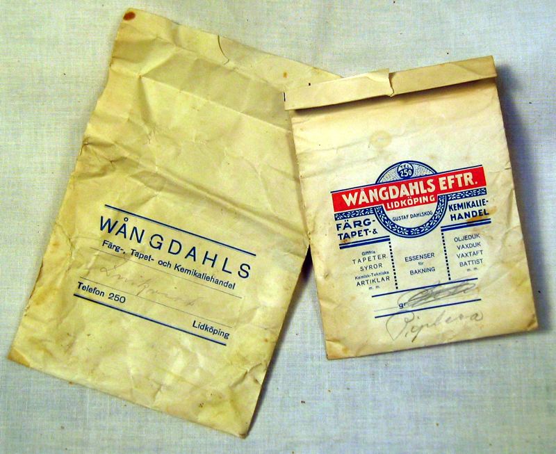 2 st papperspåsar från Wångdahls Färg-, Tapet- och Kemikaliehandel, den mindre har innehållit piplera och den större Zinkvitt. Tryck i blått respektive rött.