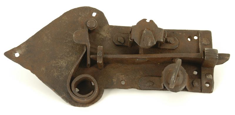 Smällelås av järn varav mekanismen är fäst på en pilliknande ytterplåt. Ur nyckelhålet sticker en pigg ut. På baksidan finns en ögleskruv med funktion att öppna låset.