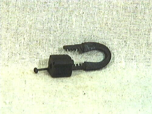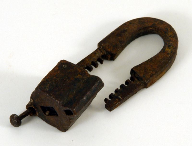 Hänglås av Polhemstyp, saknar nyckel. Modellen är konstruerad för att vara dyrksäker. Bygeln löper genom låset och är tandad på de delar som skall täckas av blocket.