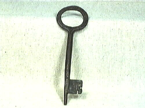 Stor dörrnyckel av järn. Cirkelformat handtag. Axet är kvadratiskt. Det har två i ena hörnet som sitter rätvinkligt mot varandra.