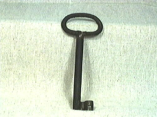 Stor dörrnyckel av järn. Handtaget är ovalt. Axeln är vågformad i genomskärning. Nyckeln är ihålig.