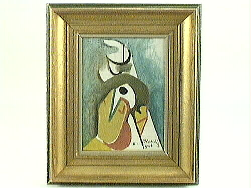 Oljemålning i blågrönt med hand i gult runt fågelhuvud i vitt, brunt och gult med stort svart öga. Signerad A, Beaudin 1946 i mörkgrått. Ramad med bred, förgylld träram, svartmålad på ytterkanterna, grå list närmast duken. På spännramen etikett från Svensk-Franska Konstgalleriet med konstnärens namn och verkets titel över otydlig stämpel (tull?). Stor stämpel "3P" samt med blå krita "Le main" och "Z.A". Svart rund stämpel på duken. Påskrift på ramen av Axel Lindahl. FRANSK. André Beaudin "Le main", målad 1946. Inköpt på Svenska-franska konstgalleriet oktober 1949, alltså samtidigt med den stora utställningen på Nationalmuseum av "Fransk konst 1938-1948". Renoveringsbehov: Smutsig, bör rengöras samt justeras i ramen. Färgbortfall av förgyllning: Dagermått: 180x260 mm. Konstnär: André Beaudin f 1895.