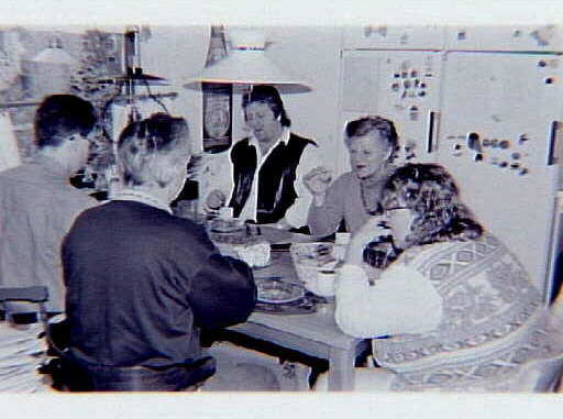 Födelsedagskaffe igen, med ryggen mot kameran : Ingemar och Kenneth Hagelin. Till vänster Jörgen Hagelin, Eivor Hagelin till höger Ulrika Nickert.