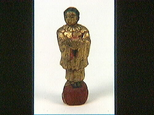Statyett av lera. En man med guldfärgade kläder som står på en röd sten. Föremålet har troligtvis kommit till Lidköping via lidköpingssonen Enoch Gillström som var missionär i Kina utskickad av Lidköpings Missionsförsamling 1912. Han stannade i Kina till 1921 för att sedan fortsätta sitt missionärsarbete i Canada.
