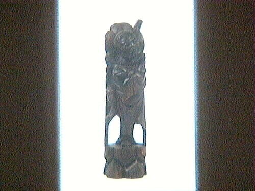 Statyett i mörkbrunt trä med metaller inhamrade. Stående man med ena bent upplyft, svärd på ryggen. Föremålet har troligtvis kommit till Lidköping via lidköpingssonen Enoch Gillström som var missionär i Kina utskickad av Lidköpings Missionsförsamling 1912. Han stannade i Kina till 1921 för att sedan fortsätta sitt missionärsarbete i Canada.