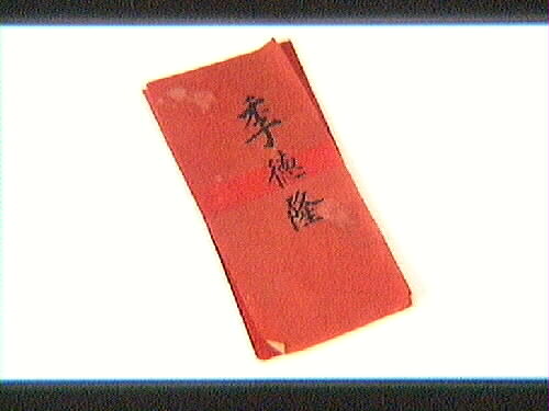 Röda pappersblad med ett kinesiskt personnamn påmålat i svart "Li Tak Fung". Föremålet har troligtvis kommit till Lidköping via lidköpingssonen Enoch Gillström som var missionär i Kina utskickad av Lidköpings Missionsförsamling 1912. Han stannade i Kina till 1921 för att sedan fortsätta sitt missionärsarbete i Canada.