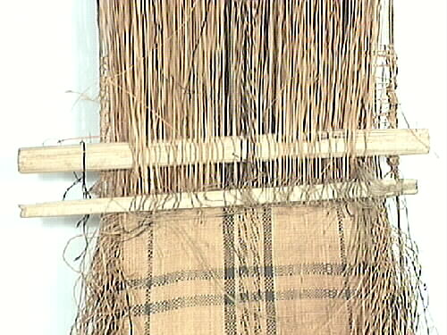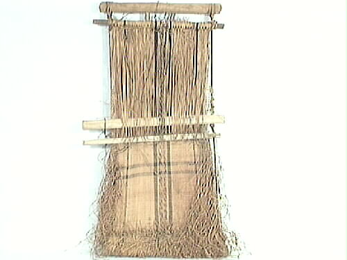 Vävstol i trä. Väv i halm. Påbörjat arbete; rutig väv i svart och ofärgat (gräs)? inslaget bildar frans utanför väven. Vävram av runda träbitar, hopfogade med bast.