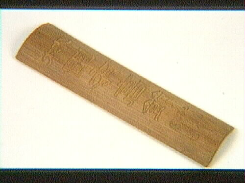 Armstöd i bambu med inristat tankespråk. Skrivet med blyerts på baksidan: "Lin nem in kao heeih" "Där är vacker ceneri i trädgården. Mannen bör likna bambu, vars löv äro gröna året runt". Armstöd användes att vila armen på när man med pensel skrev kalligrafi. Föremålet har troligtvis kommit till Lidköping via lidköpingssonen Enoch Gillström som var missionär i Kina utskickad av Lidköpings Missionsförsamling 1912. Han stannade i Kina till 1921 för att sedan fortsätta sitt missionärsarbete i Canada.
