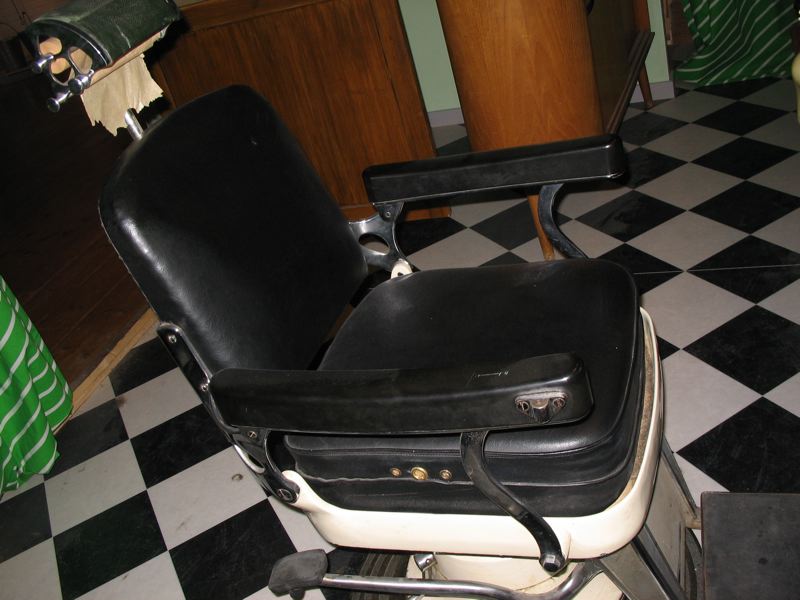 Frisörstol. Svart skinnklädsel med nitar. Vitmetall spakar, armstöd i svart bakelit. Huvudstöd i vitmetall med papper. Beige stativ. Bilaga: Handledning, arkiv 219: 5M16-015517. Föremålet kommer från Herrmanns frisersalong, Älvgatan 6, Lidköping. Dess sista ägare var Ebbe Lugner som 1982 tog över efter tre generationer Herrmann. Salongen startade 1861 och lades ner 31 december 1993.
