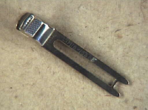 Hårklämma. Klämdelarna bildar benpar. Föremålet kommer från Herrmanns frisersalong, Älvgatan 6, Lidköping. Dess sista ägare var Ebbe Lugner som 1982 tog över efter tre generationer Herrmann. Salongen startade 1861 och lades ner 31 december 1993.