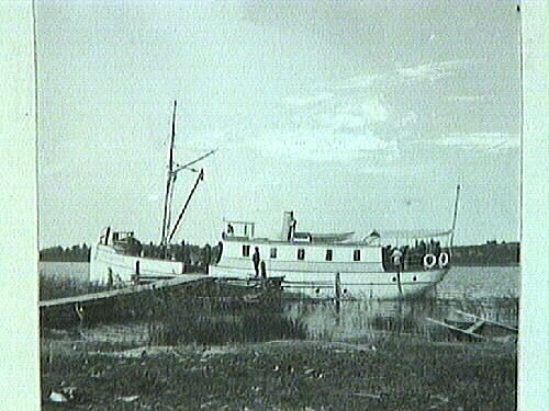Motorbåten "S/S Kållandsö" vid bryggan på Kålland. (Tidigare inventarienummer M-701, fotografens nummer 112, glasplåt med två motiv).
