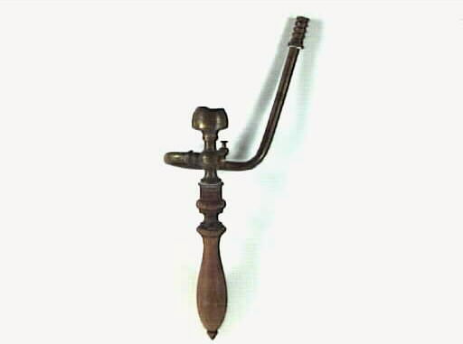 Gasbrännare. Svarvat handtag. Böjt rör av gulmetall. Sliten. Föremålet kommer från Herrmanns frisersalong, Älvgatan 6, Lidköping. Dess sista ägare var Ebbe Lugner som 1982 tog över efter tre generationer Herrmann. Salongen startade 1861 och lades ner 31 december 1993.