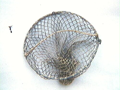 Fiskkasse som användes vid vägning av fisk vid försäljning i saluhall. Användes till siklöja. Plats för ungefär 1 kg fisk. Maskstorlek: 20 mm.