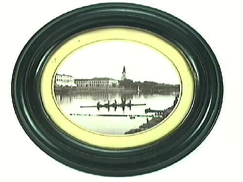 Svartvitt fotografi inramat med glas och en svart oval ram. Motiv: Lidköpings hamn med Lidan. I förgrunden en roddbåt med fem roddare, i bakgrunden Gamla staden med kvarteret Domherren och S:t Nicolaikyrkan, rådhuset och Hotell Lidköping.