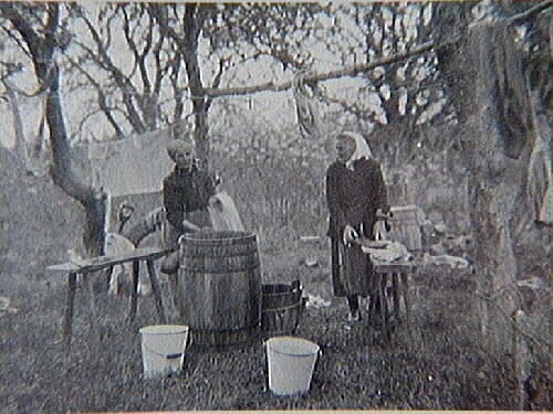 Tvättdag i Åhagen på gården Ekes mark i Na Kedum. Matilda (Tilda) Hovander (1874-1945) till vänster och Chalotta Skall (1859-1946) till höger. Chalotta (Lotta) var född i Råda och under många år var hom anställd hos en judiskt familj i Stockholm. Efter familjens bortgång bosatte hon sig i en liten stuga i Na Kedum inte långt i från där bilden är tagen.