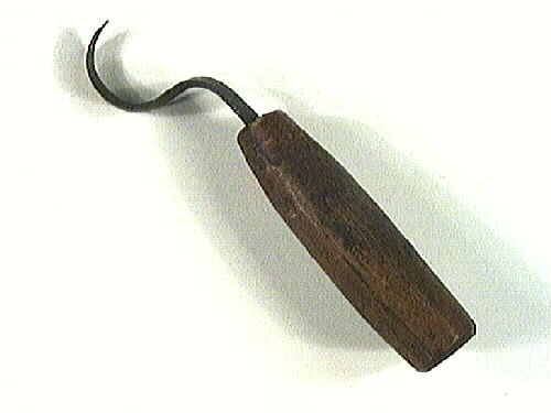 Skedkniv med krokliknande blad och trähandtag. Handsmitt.