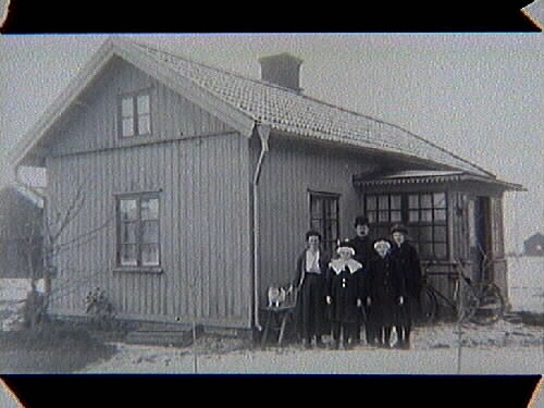 Familjen Warnicke vid förstutrappan, fr. vä. fru Hilma, döttrarna Daga, Åsa och Karin samt fadern Ernst. Vagnslackerare hos målarmästare Nils Andrsson i Lindstrandsgården.