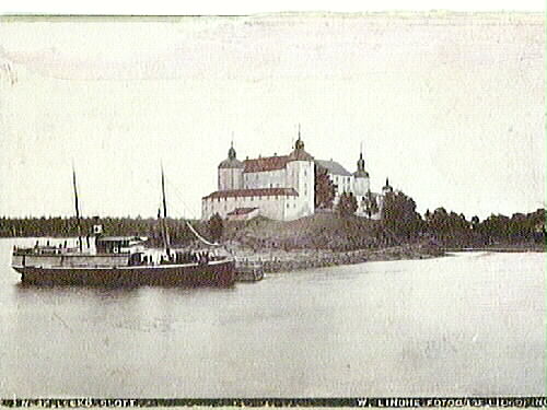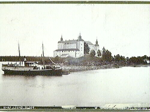 Läckö slott från nordväst. Vid bryggan ångaren "Lidköping". Förlaga till vykort, något retuscherad.