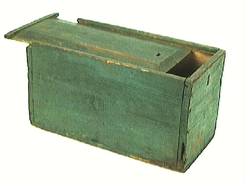 Träskrin med draglock, blå/grön målat. Locket är skjutbart och fasat för att passa i lådans spår. På en av kortsidorna samt i locket finns hål för att kunna låsa skrinet. Inuti sitter 3 läderfickor, två på kortsidan och en på långsidan. Under dessa fickor finns en läderhöjning. Skrinet är ihopsatt med spik, på 80 mm avstånd från locket sitter två nubb. I skrinets ena hörn, på botten finns ett hål. Kan eventuellt ha använts som verktygsskrin. Föremålet har tidigare varit utställt i Rackebystugan vid Lunnelid i Råda.