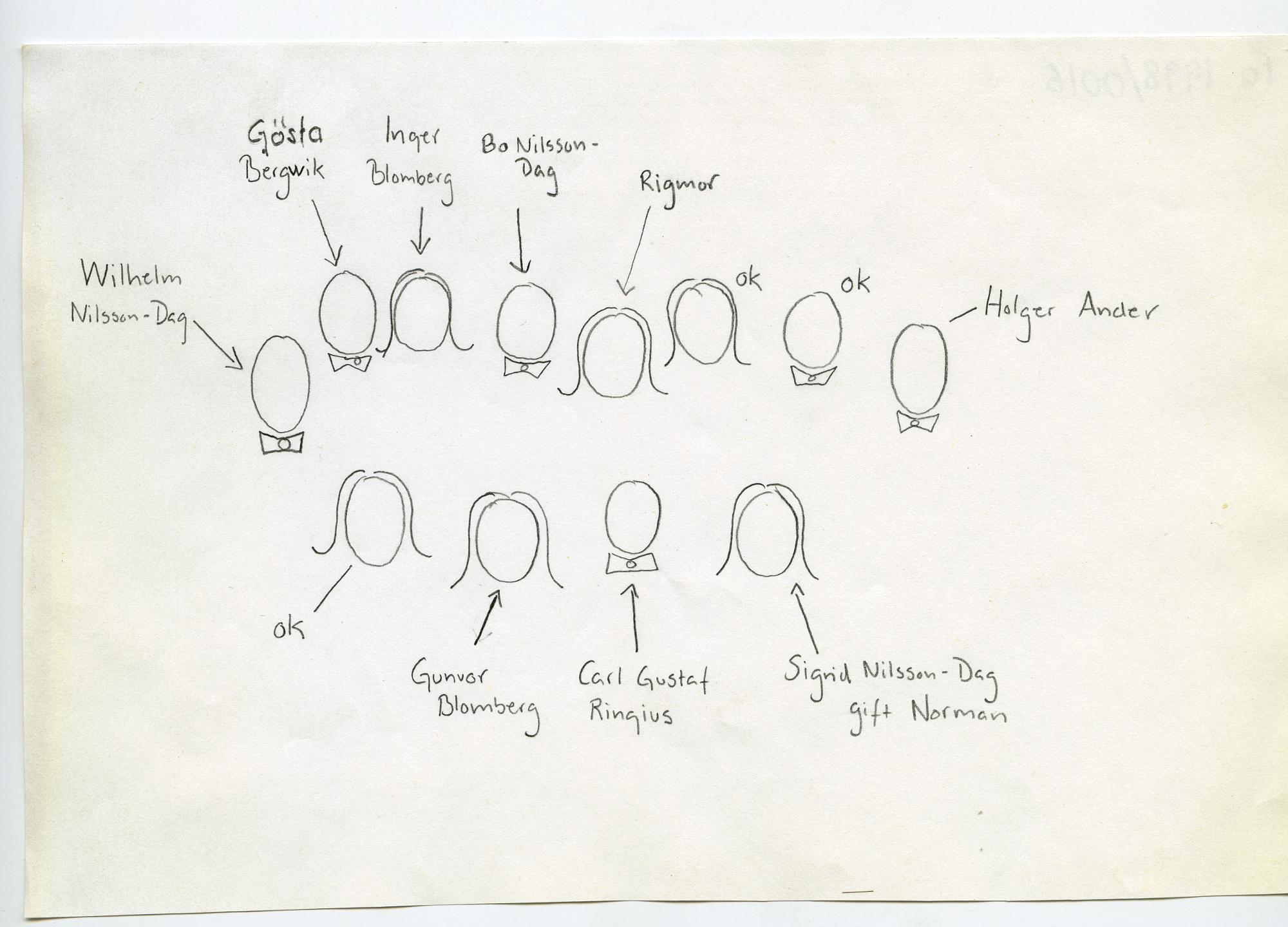 Med vid förlovningen var: Wilhelm Nilsson-Dag, Göta Bergwik(?), Inger Blomberg, Bo Nilsson-Dag, Holger Ander, Rigmor Ander, Sigrid, Nilsson-Dag, gift Norman.