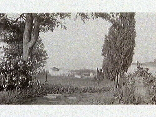 Sjövik, vy från sommarvillans terass mot sjön, fartygsratt bärgades omkring 1925 och sattes upp vid sjön.