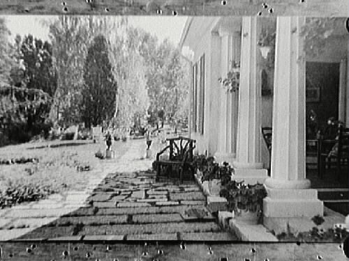 Stensättning, togs ett skeppslast med kalksten från Kinnekulle, pelarna gjorda av drivved som bärgades från Vänern. Amplar med pelargonier.