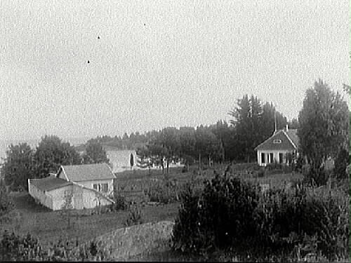 Vy över Sjövik, Kålland, Lidköping, växthus till vänster, på gavel vedbod och dass.